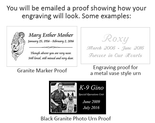 Patterns "veining" and colors will vary from the picture as no two marble cremation urns are exactly the same.Due to the design, proofing process, and engraving, this item usually ships in 1-3 business days. We will design your urn and email you a proof of what the side(s) will look like. The proof is typically emailed in less than 1-2 business days. At this time you can make any corrections you may need or approve it for engraving. Once the proof is approved by you, the urn is engraved within 1-2 business days and shipped. Click here to view a sample proof. - This urn is x-rayable and an approved for air travel.